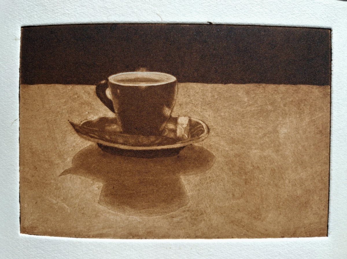 L’aquatinte au sucre permet de peindre au pinceau avec une plus grande liberté de geste ou de détails les zones qui seront couverte d’aquatinte et mordues à l’acide. Le terme de sucre correspond à un mélange d’encre de chine et de sucre (on peut utiliser une acrylique opaque également).