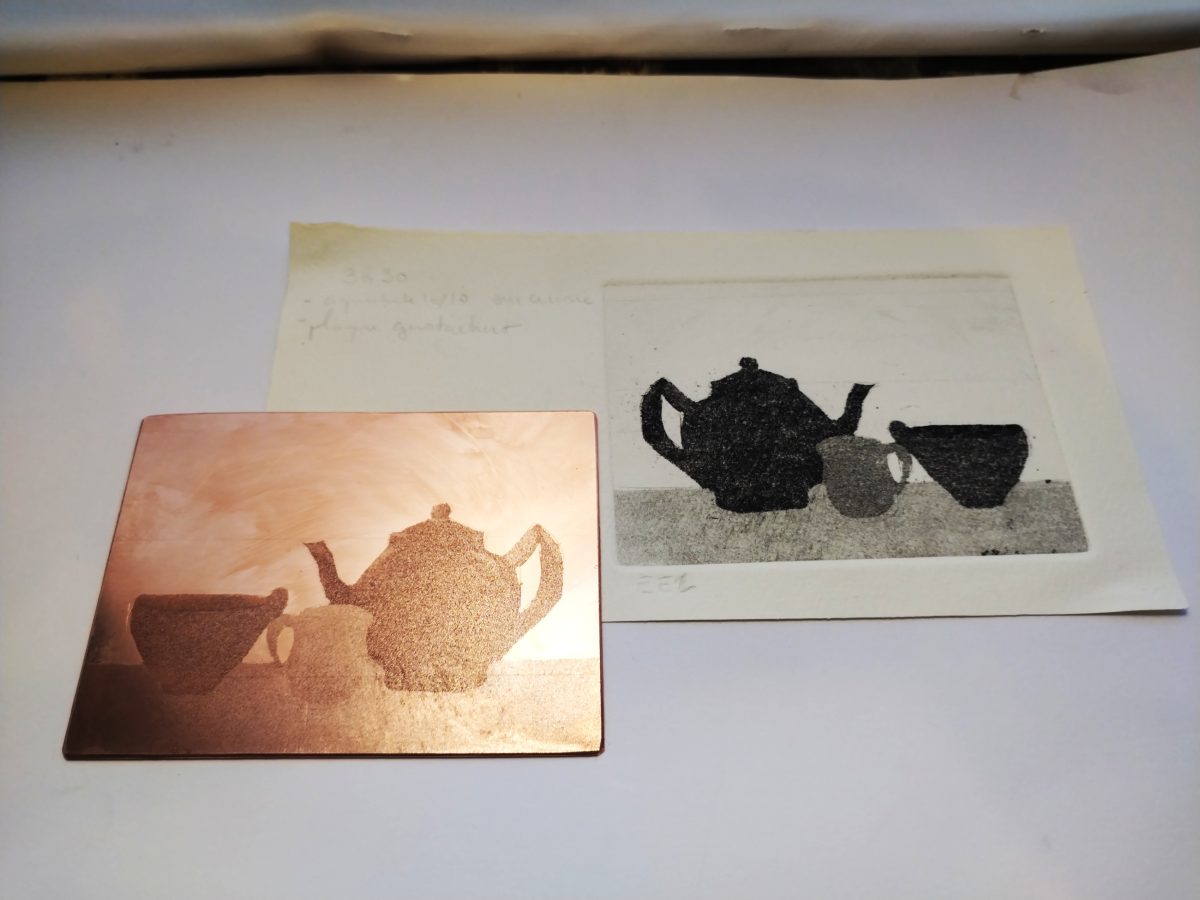 Les traits sont creusés dans le vernis posé sur le cuivre à l’aide d’une pointe sèche puis la plaque est trempée dans l’acide de perchlorure de fer pour les creuser. Le temps de morsure dans l’acide permettant d’obtenir des creux de différentes profondeurs qui une fois encrés offriront des tons dégradés à l’impression. Lors de ce stage il sera abordé l’utilisation des vernis et des temps de morsure dans l’acide pour obtenir des valeurs différentes.